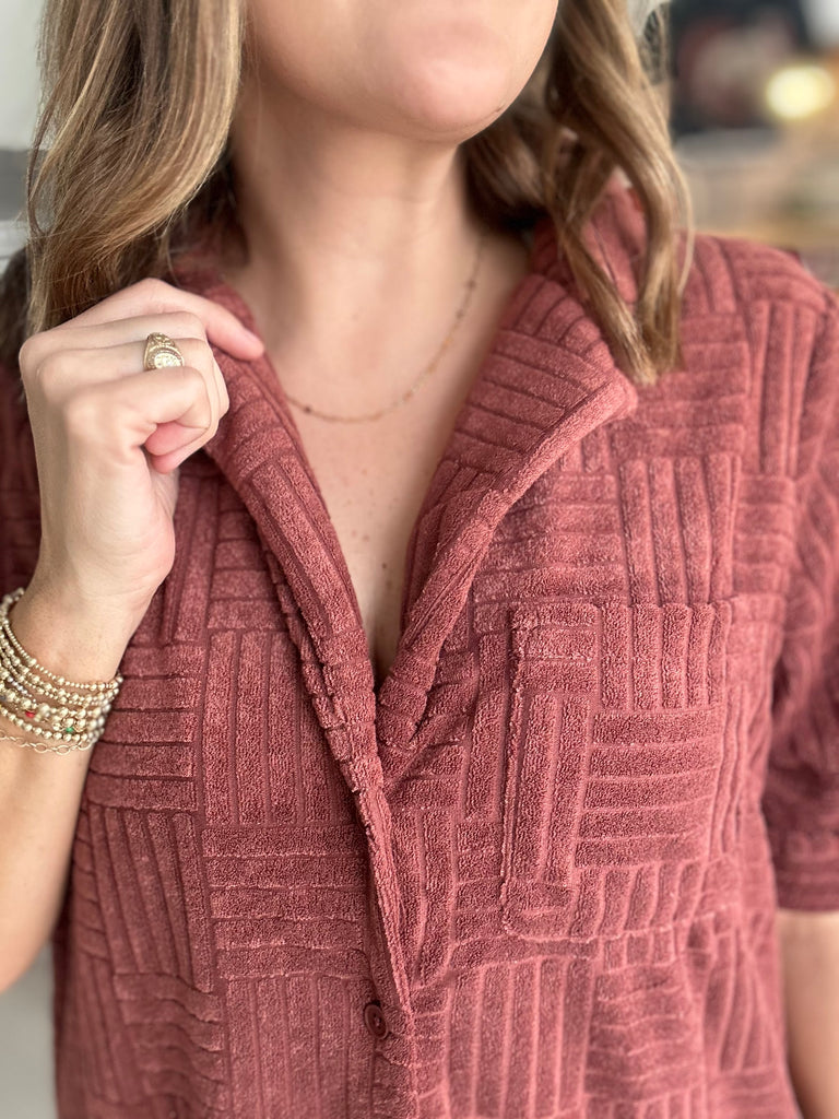 Look and feel great in this textured knit dress this fall season. This shift style dress has functional buttons, side pockets and is cute from sneakers to booties or wedges. Available in sizes Small to Large and size Medium is shown.