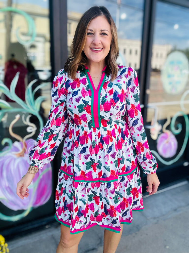 Our Southern Floral Dress has eye catching colors and beautiful floral print! Great for work, family photos, weddings, upcoming holidays or a great piece to make you feel good each day! This dress is also fully lined and has pockets on the side. Available in sizes Small to X-Large and size Medium is shown. Sizing is as suggested. This dress runs true to size.