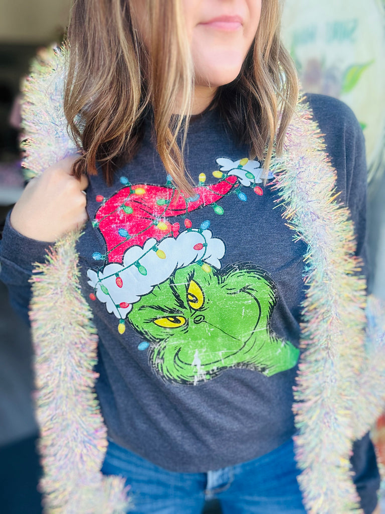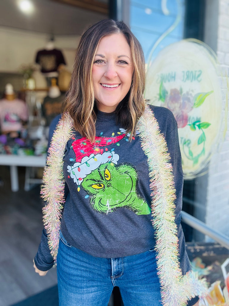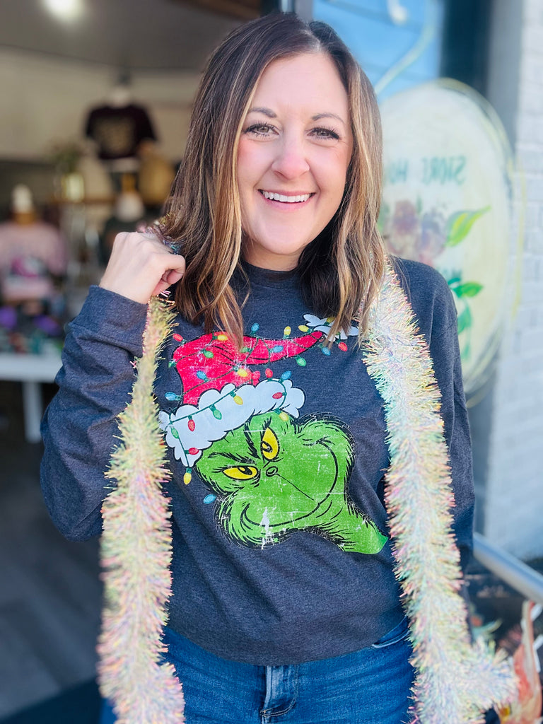 Each year we add a new Grinch to the collection and couldn’t pass this guy up! We put him on a longsleeve charcoal Tultex tee and size Medium is shown.