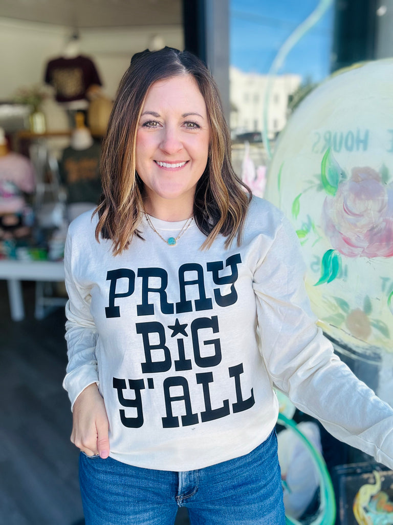 Pray Big Y’all is on a cream Tultex long sleeve tee. Sizes Small to 3X is available - size medium is shown.