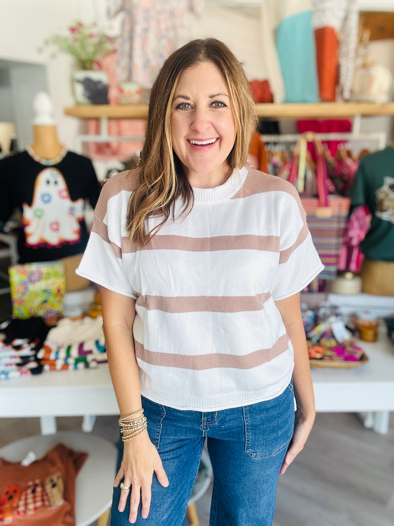 Our Cute in Khaki top is the perfect transition to fall. This a short sleeve, light weight sweater material with a classic neutral stripe. Size Medium Is shown.