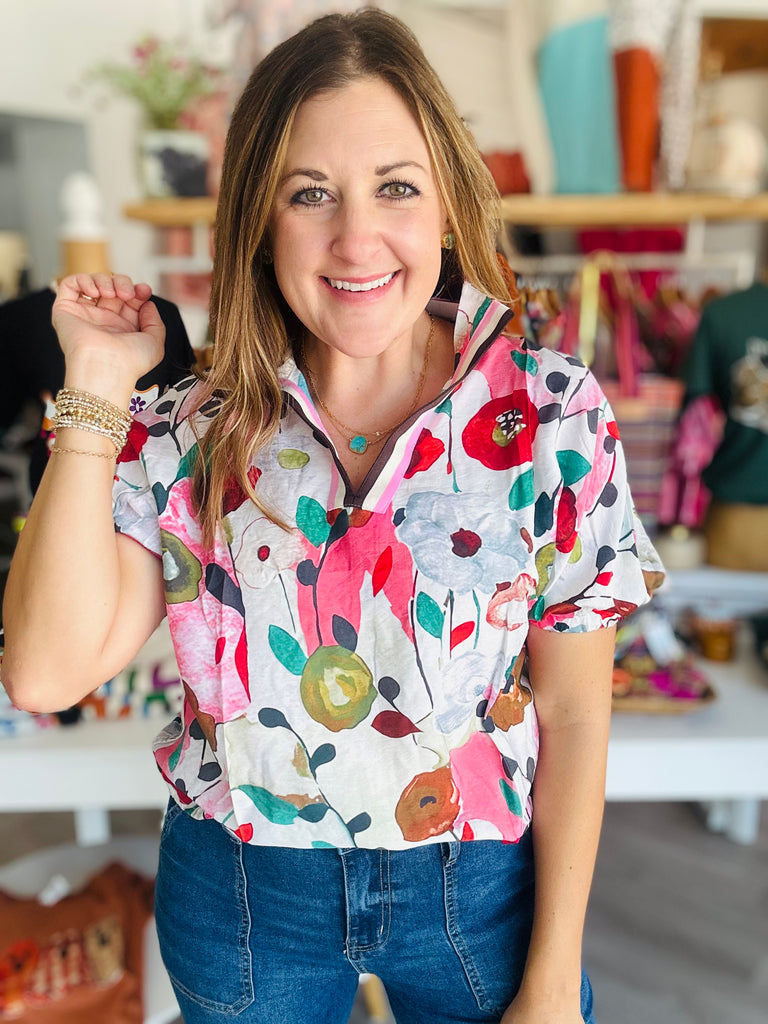 Stay and feel stylish in our new fall florals print top! The color combination and fun print is definitely is a stand out piece!