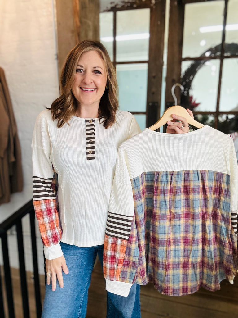 Our Beige Plaid Patchwork top is the perfect fall top. The shirt is a classic go to that you can wear over and over again and layer as we get into those cooler months.