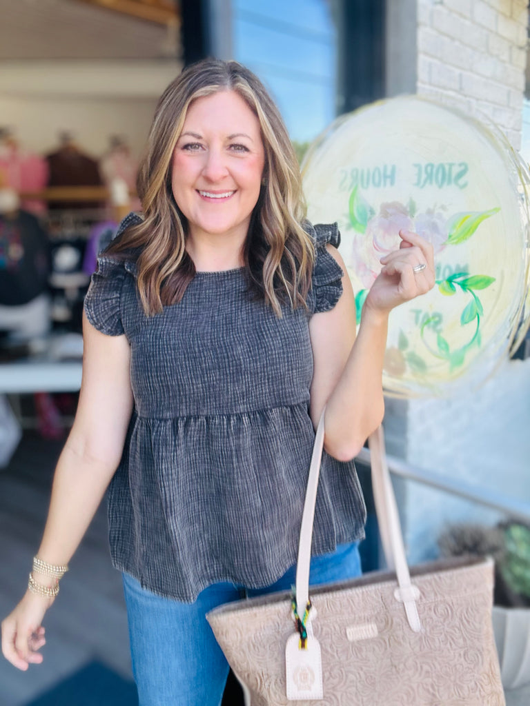 This acid wash black peplum is that perfect piece to add to you closet! It has a little ruffle for that extra flair and is a great closet staple!