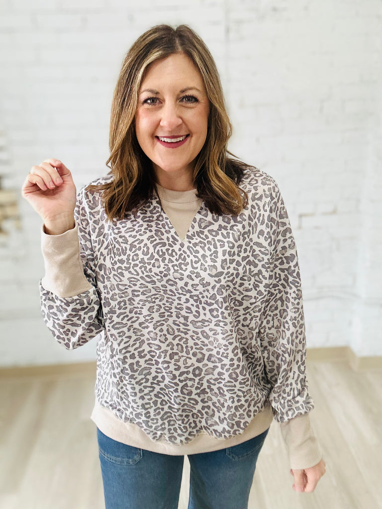 Looking for that perfect sweatshirt for the season - this leopard crewneck is OH SO COZY!! Pair it with your favorite jeans and booties or sneakers for a cute casual look. Available in sizes Small to X-Large and size Medium is shown.
