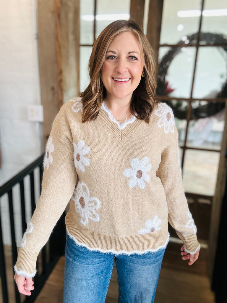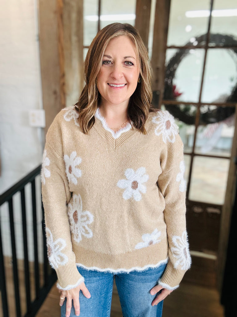 Meet our Flower sweater - The BEST Staple for the Fall and Winter! Cozy up this season in this cute monochromatic piece. Available in sizes Small to X-Large and size Large is shown.