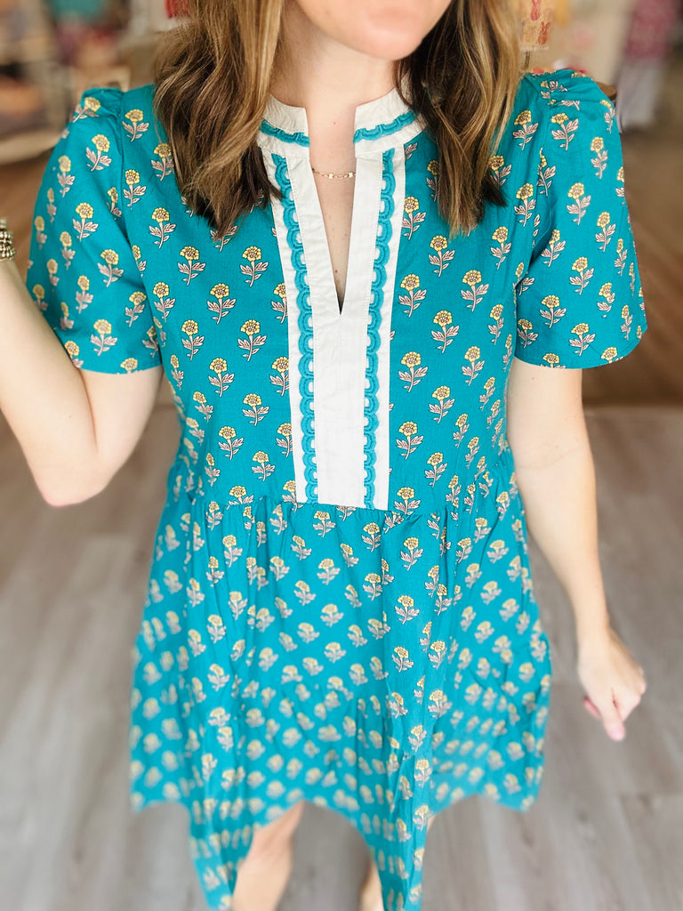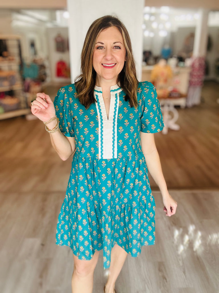 Our Green dress has eye catching colors and beautiful floral print! Great for work, vacations, weddings, or and fun day to day! Available in sizes Small to X-Large and size Medium is shown. Sizing is as suggested. This dress runs true to size.