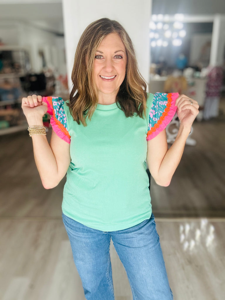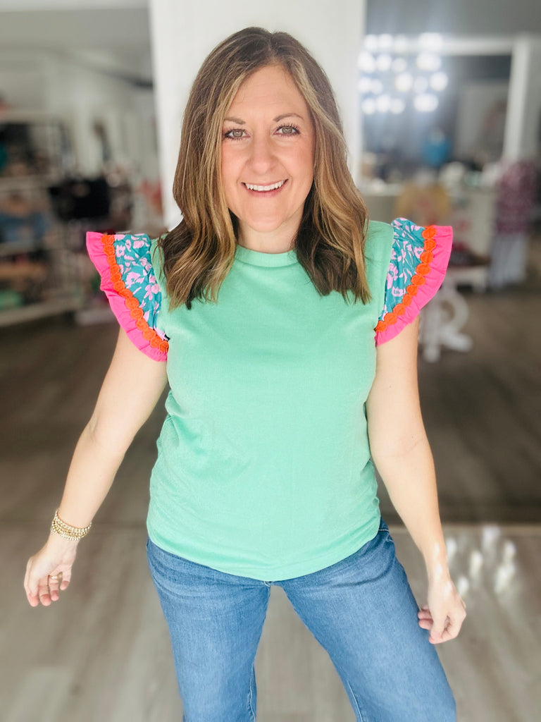 This green basic is such a great closet staple and the colorful sleeve adds that extra little texture to dress up a casual piece. Available in sizes Small to Large and size Small is shown.