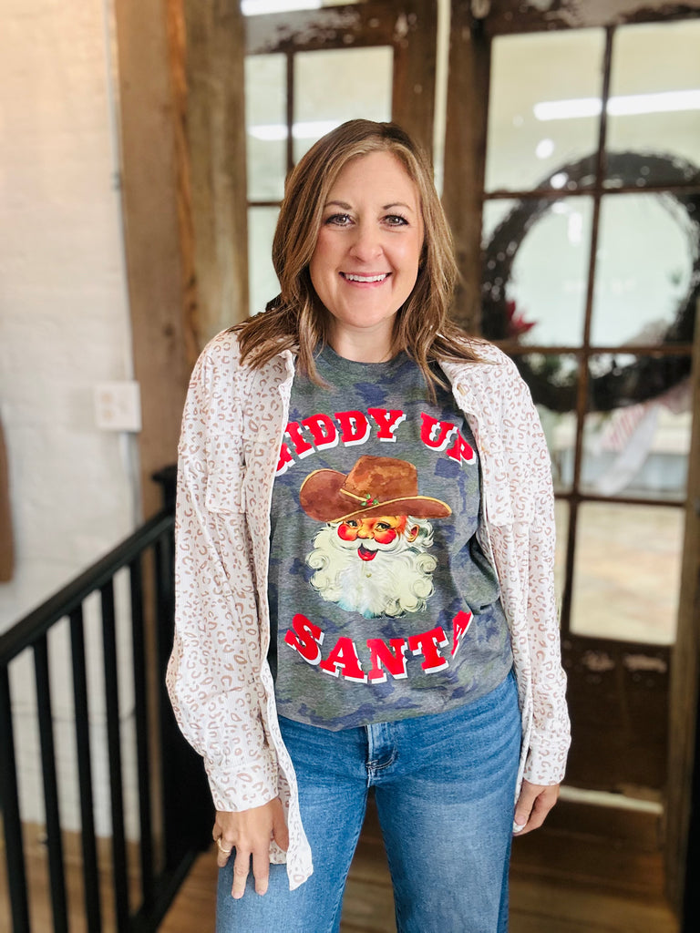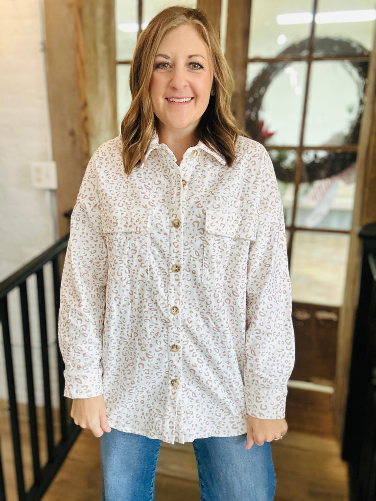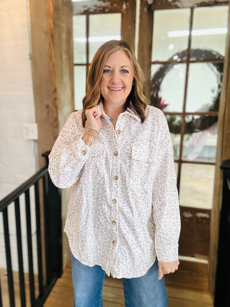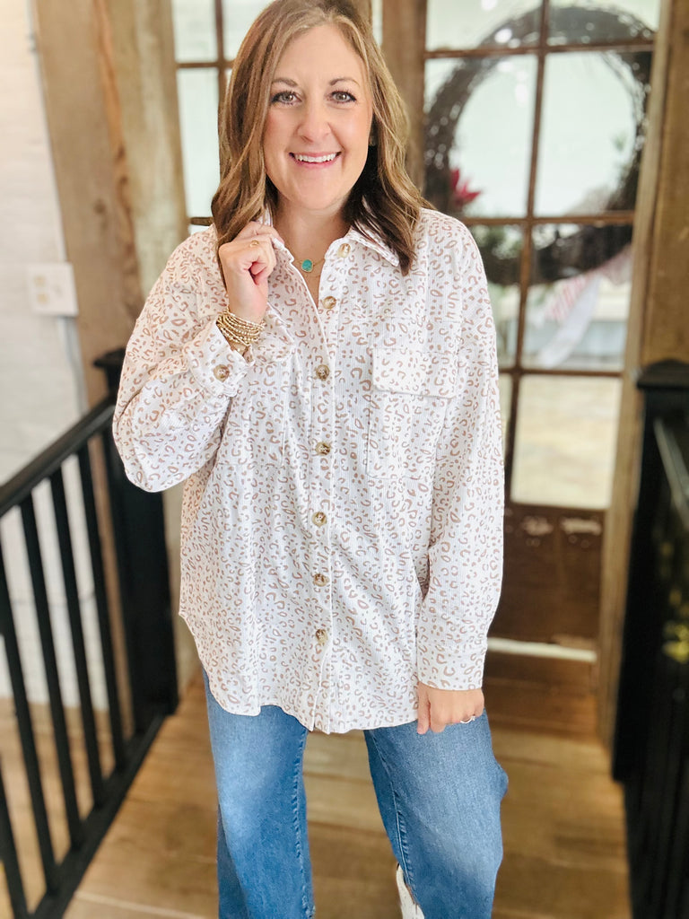 Get excited!! The best little leopard shacket has ARRIVED!! Wear it buttoned as a top with leggings or jeans or layer it with a cute graphic tee!! Available in sizes Small to X-Large and size Small is shown. If you are between sizes, you can size down on this one and still have a relaxed fit.