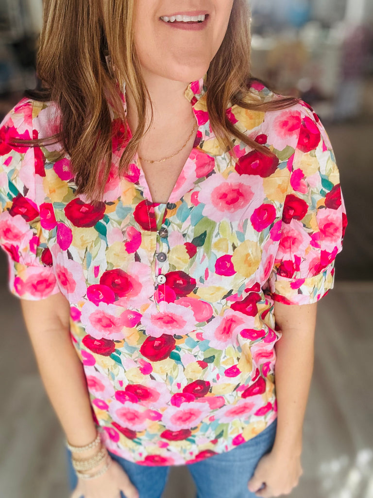 This colorful floral is that perfect piece to step into spring! It has a little ruffle for that extra flair and is a great closet staple!