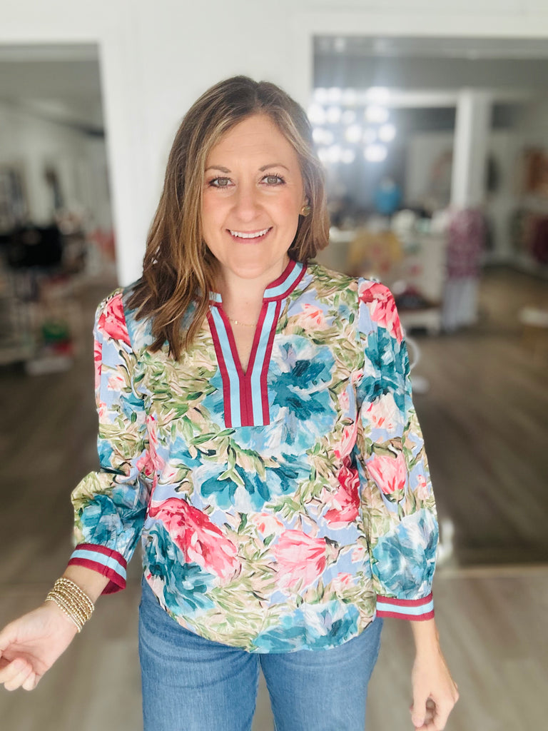 This colorful stripe + floral is that perfect piece to step into spring! Great transition piece to spring and a go-to piece for work, day to day, showers - you name it!