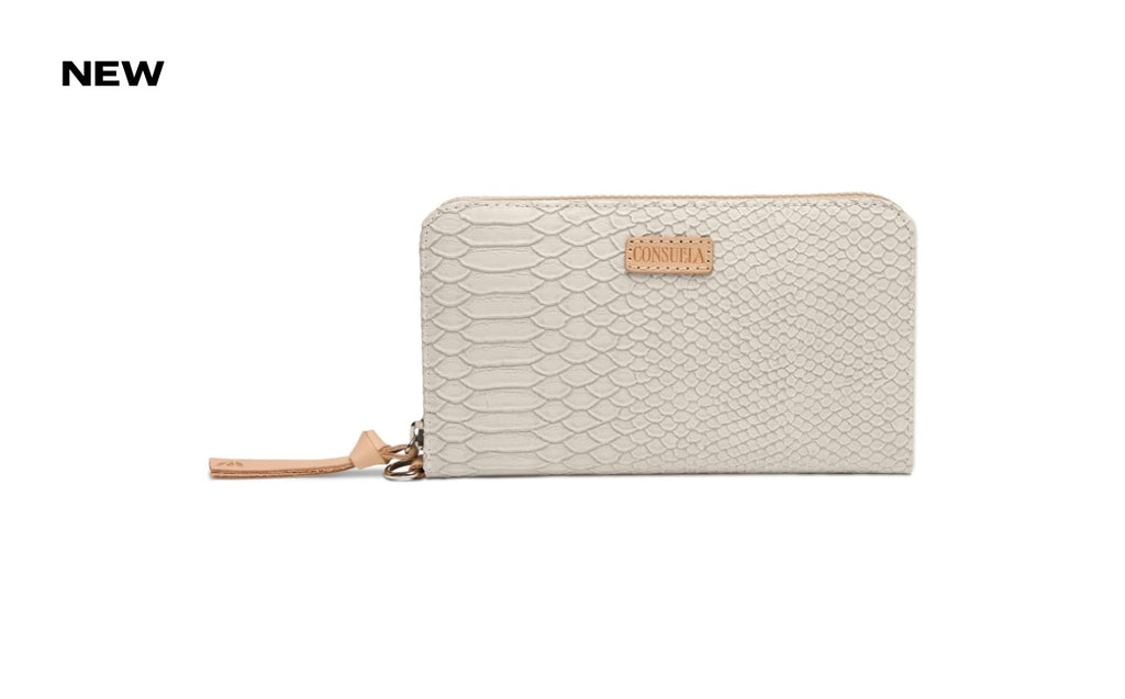 Function and versatility in the palm of your hand. Our Essential Wallet is a streamlined, large-capacity wallet with plenty of room for cards, cash, and receipts — plus a zippered center compartment for coins and keepsakes. We added a D-ring so you can easily clip it to any Consuela wristlet strap or anchor onto an inside lanyard for added security.